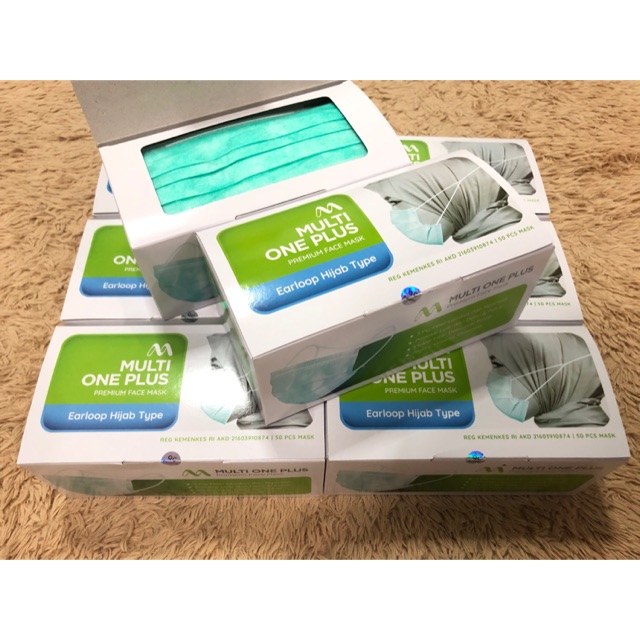 Ready Masker Medis Multi One Plus Headloop type 3 Ply KEMENKES BFE 99 ISO Certified original Multi One Plus dengan embos logo di tiap masker Harga untuk 1 box isi 50 pcs Spesifikasi Headloop 3 ply dengan 3 lapisan Lapisan dalam berwarna putih nonwovenLapisan tengah Filter BFE antivirus meltblownLapisan luar berwarna hijau muda Maker Headloop Hijab 3 ply multi one plus Read